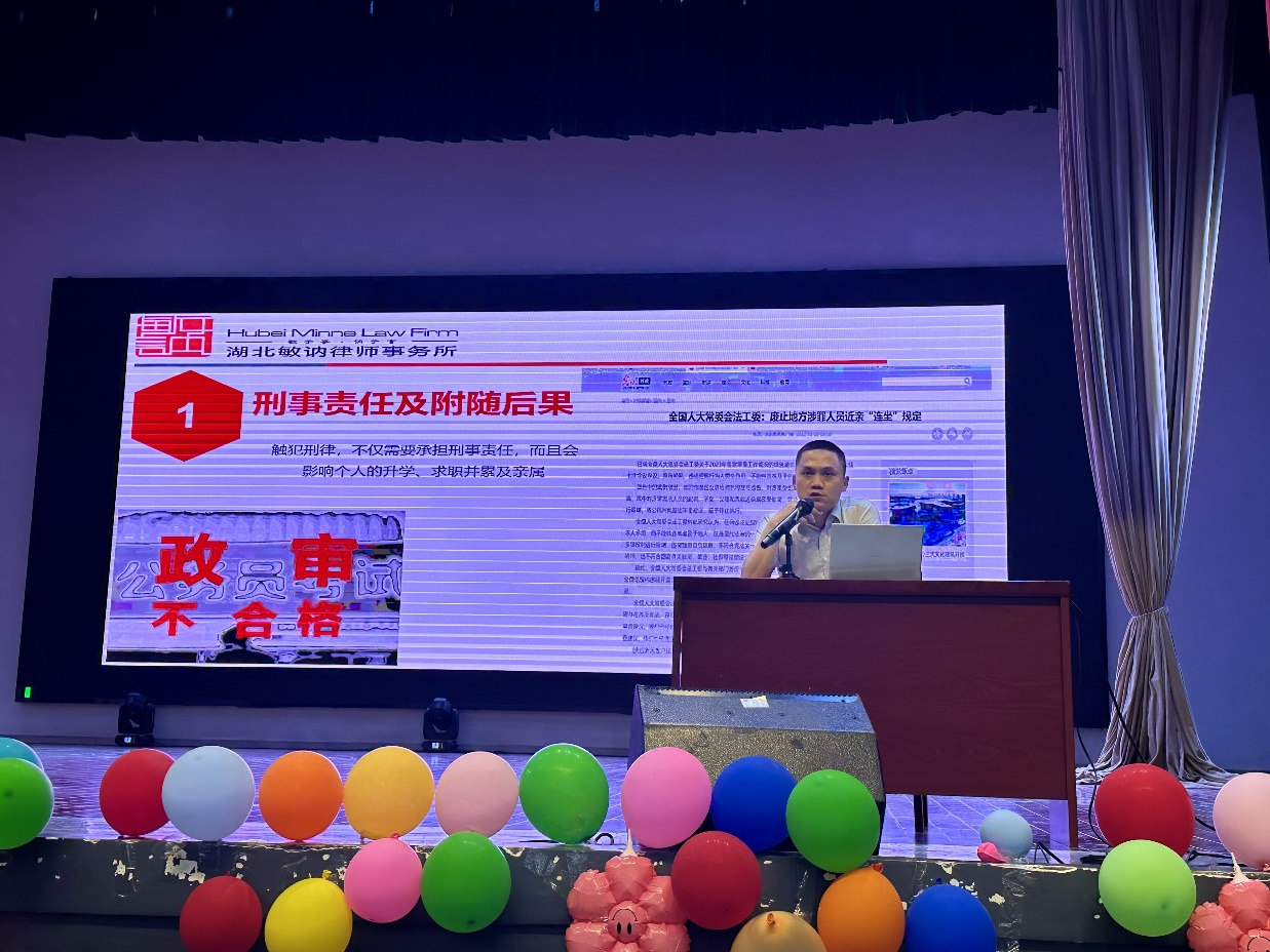 (通讯员:涂晟楠)为引导广大师生学法、懂法、守法,进一步增强员工的法律意识和安全意识,营造文明、和谐、安全的校园环境,5月31日下午,员工工作部与三亿体育在公司大礼堂举办法治安全教育专题讲座,此次专题讲座主讲人为北敏讷律师事务所合伙人律师、武汉市优秀青年律师左先思,公司全体辅导员和各公司员工代表参加讲座。