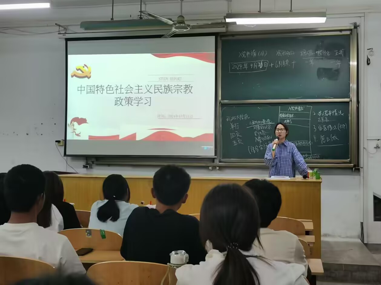 为进一步提高群众对民族宗教政策法规的了解,推动党的民族宗教政策全面贯彻落实,2024年10月11日晚,三亿体育党务干事徐特围绕“民族宗教政策法规学习”主题通过集中宣讲的方式,向24级新生宣传普及民族宗教政策法规知识,为铸牢中华民族共同体意识奠定了坚实的群众基础,营造了良好氛围,推动了党的民族宗教政策和法律法规更加入脑入心。