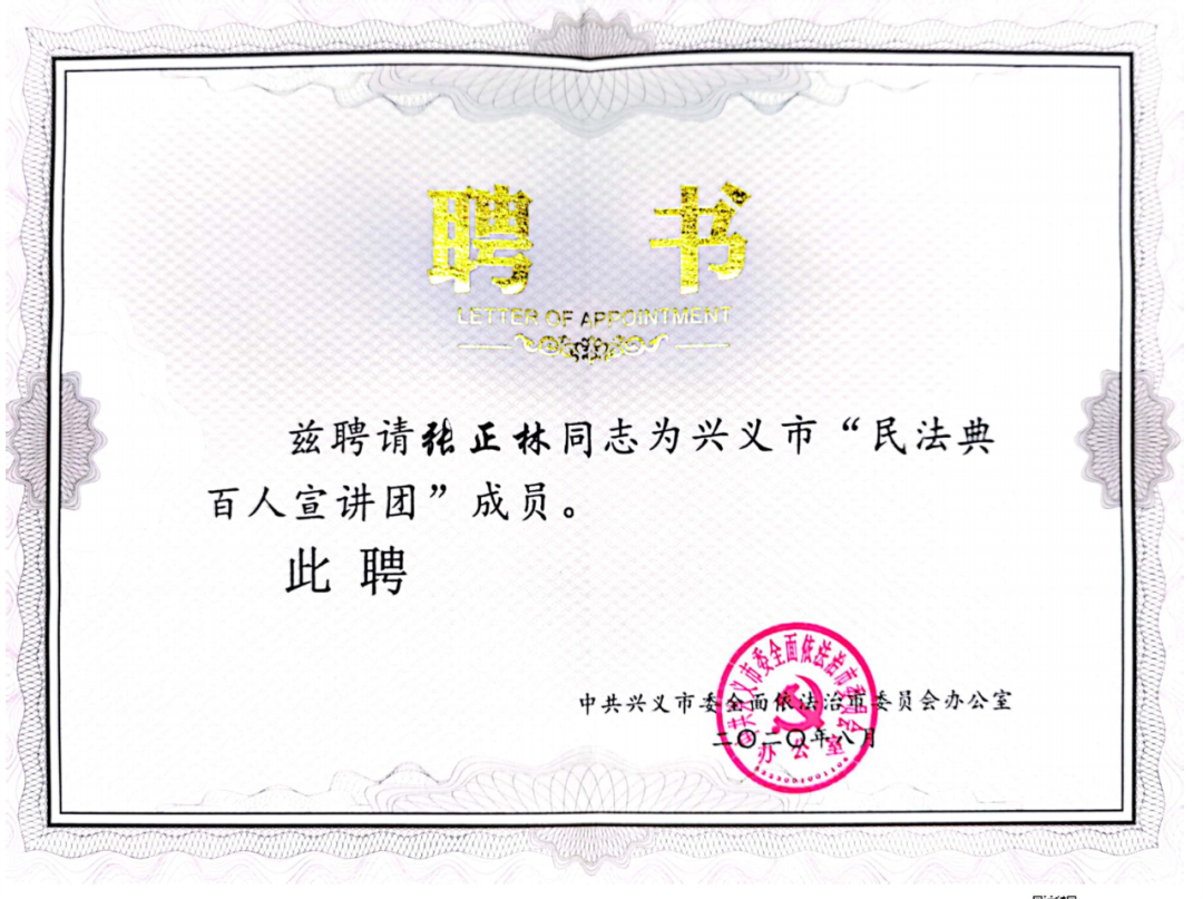 2020年8月,被中共兴义市委全面依法治市委员会办公室聘请为兴义市“民法典百人宣讲团”成员。