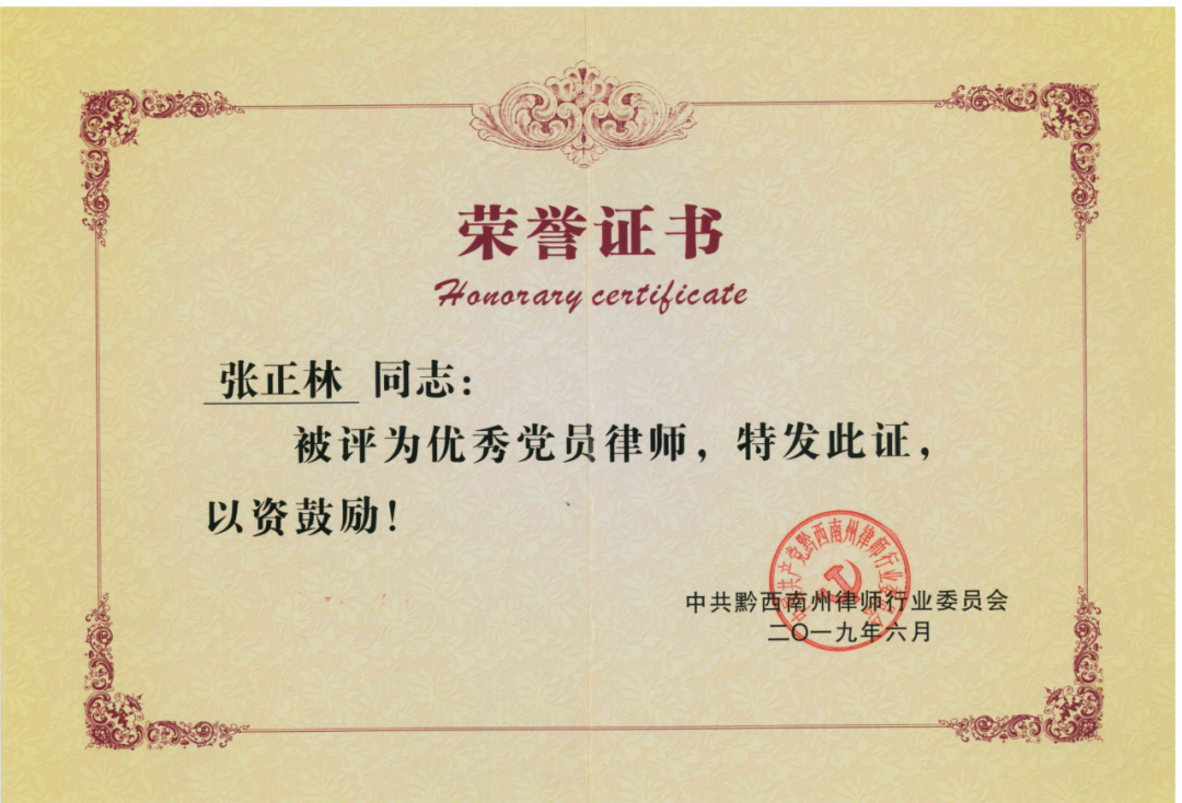 2019年6月,被中共贵州省黔西南州律师行业委员会评为“优秀党员律师”。